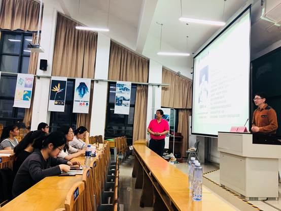 全国大学生海洋文化创意设计大赛组委会秘书长、中国海洋大学管理学院吴春晖教授通过100余幅运用海洋元素进行创意的优秀作品,向同学们展现了神奇的海洋世界,提醒同学们要从人文角度去认知海洋、提升海洋保护意识,希望同学们投入到建设海洋强国的事业中,为我国未来海洋事业发展做出贡献。吴春晖教授还通过自己多年的实践和丰富的案例向同学们阐述了创意源于生活的理念,报告会气氛活跃、讨论热烈。