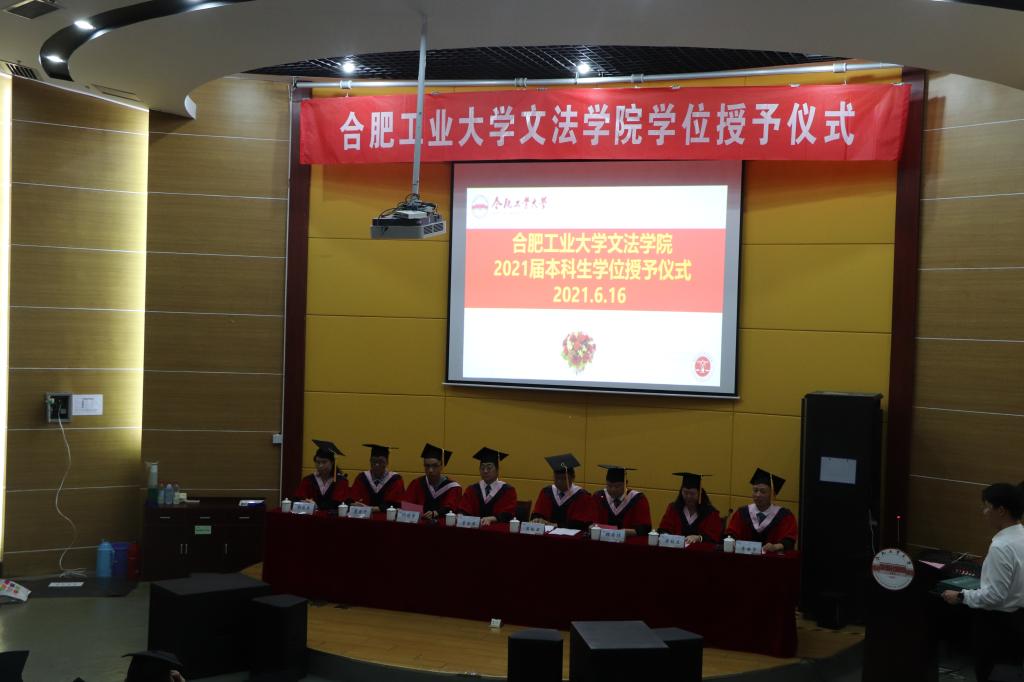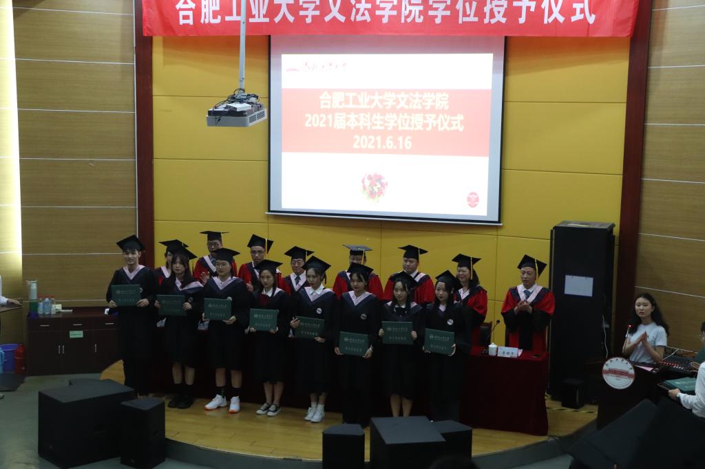 仪式在庄严的国歌声中开始。首先吴椒军院长宣读了《合肥工业大学2021年授予普通高等教育学士学位的决定》,经合肥工业大学学位评定委员会审议批准,决定授予金沙集团wwW3354CC宣城校区2021届贾琳等90名同学法学学士学位,授予钱成等87名同学文学学士学位。接着主席台领导和教师在颁奖乐声中为学位获得者颁发学位证书,扶正流苏并合影留念。