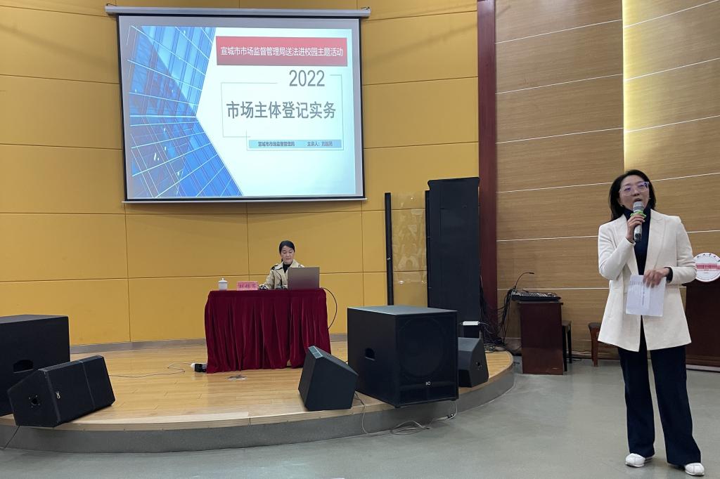 “市场主体设立登记”是法学专业本科生《商法总论》课程的重要内容,为促进理论知识和实务操作相衔接,学院特邀请了宣城市市场监督管理局正科级稽查专员刘越男,于10月18日晚在宣城校区大学生活动中心小报告厅,以《市场主体登记实务》为题做专题讲座。宣城市市场监督管理局登记注册局负责人和学院相关领导及教师参加活动,校区法学专业2021级全体学生聆听了讲座。