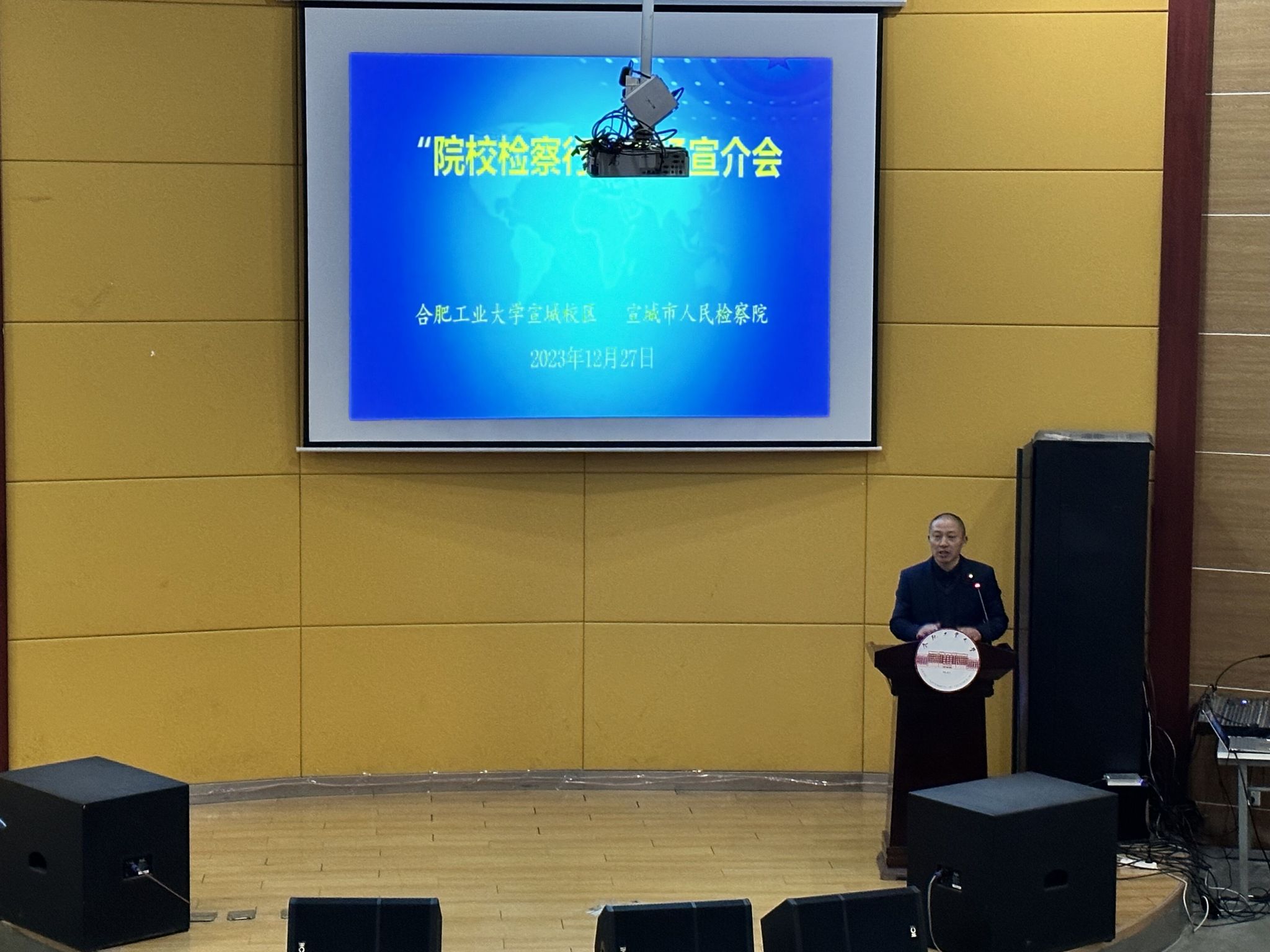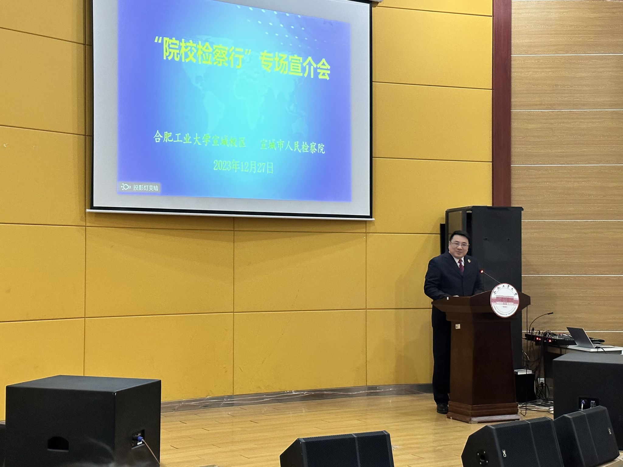 12月27日,宣城市检察院党组成员、政治部主任谢斌一行来到合肥工业大学宣城校区开展“院校检察行”宣介活动。合肥工业大学宣城校区党委副书记、管委会常务副主任方留、党政办副主任兼组织人事办公室主任张胜贵出席活动。学院文法系师生代表参加活动。
