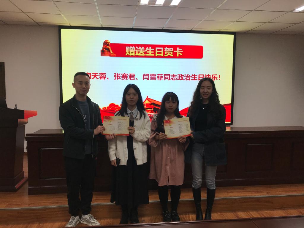过“政治生日”是理想信念的再教育、是责任使命的再承诺,程序上入党是一生一次的事,思想上入党是一生一世的事,要永远“不忘初心,牢记使命”。在这一庄重严肃的场合,张玉龙带领与会党员面对党旗宣读入党誓词,白月宣读生日贺词,董舒婕、张玉龙为过政治生日的党员赠送生日贺卡,支部合唱红歌并纷纷送上美好祝福。收到贺卡的陶天蓉和张赛君同学深受感动与激励,两人发表了生日感言,表示非常感谢党组织的关怀,今后要牢记党员身份,认真履行党员义务,继续发挥先锋模范作用。