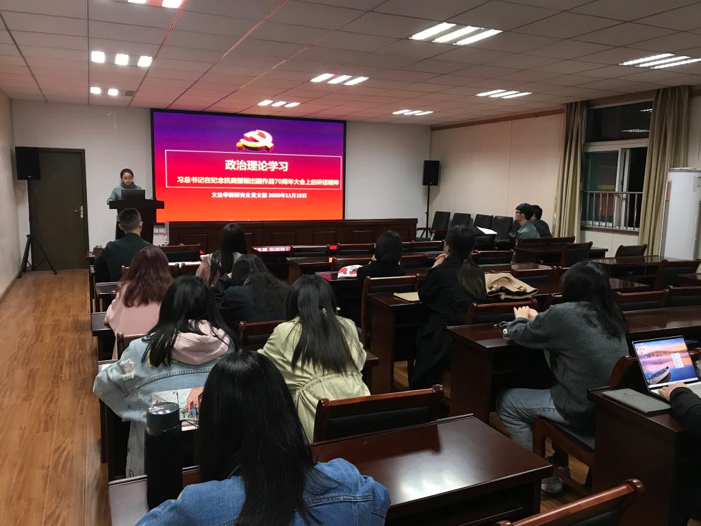 10月25日是中国人民志愿军抗美援朝纪念日,为纪念抗美援朝烈士精神,进一步弘扬以爱国主义为核心的民族精神,2020年 11月15日,金沙集团wwW3354CC研究生党支部于学院509教室举办了“纪念抗美援朝精神”主题理论学习活动,以牢记历史,增强大学生的爱国教育。