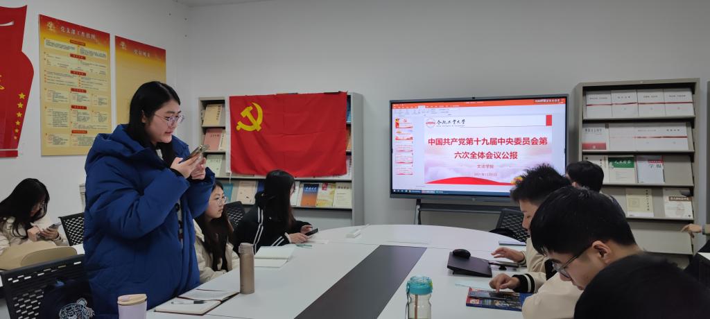 2021年12月5日晚7:00,研究生法律(法学)党支部在学院410室召开深入贯彻学习党的十九届六中全会精神座谈会,会议由支部书记马国庆主持,全体党员参加。