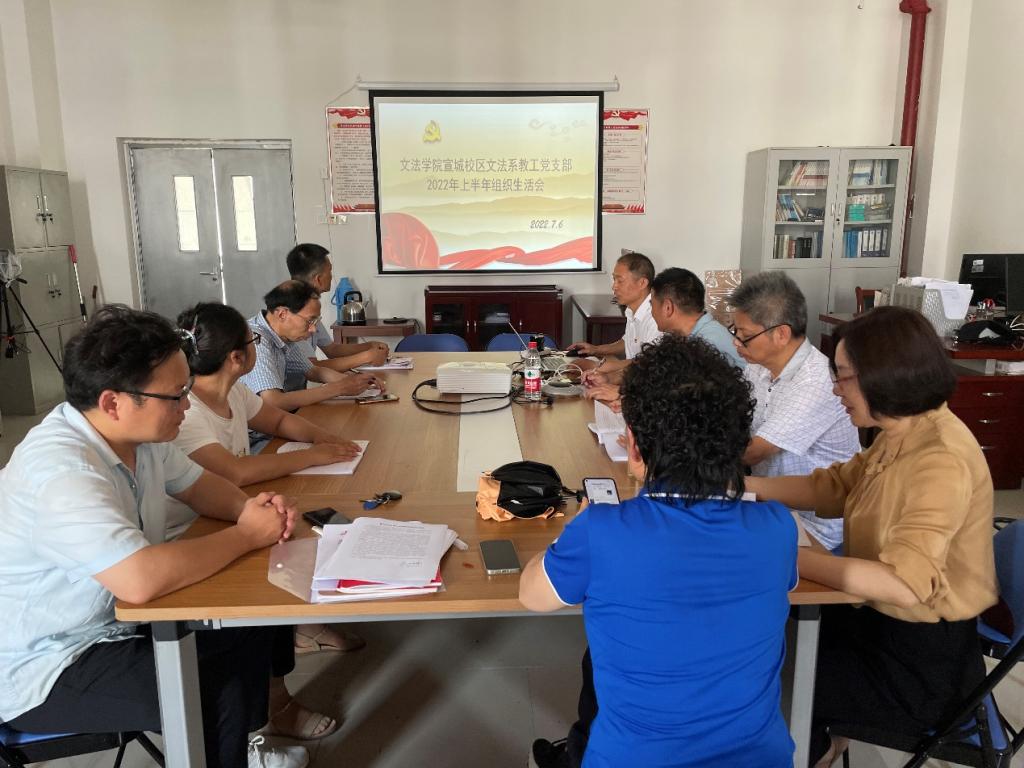 2022年7月6日下午,文法系教工党支部于综合实验楼二-309会议室召开了2022年上半年组织生活会,宣城校区学生工作办公室主任盛义保同志到会进行交流、点评,组织生活会取得了扎实成效。