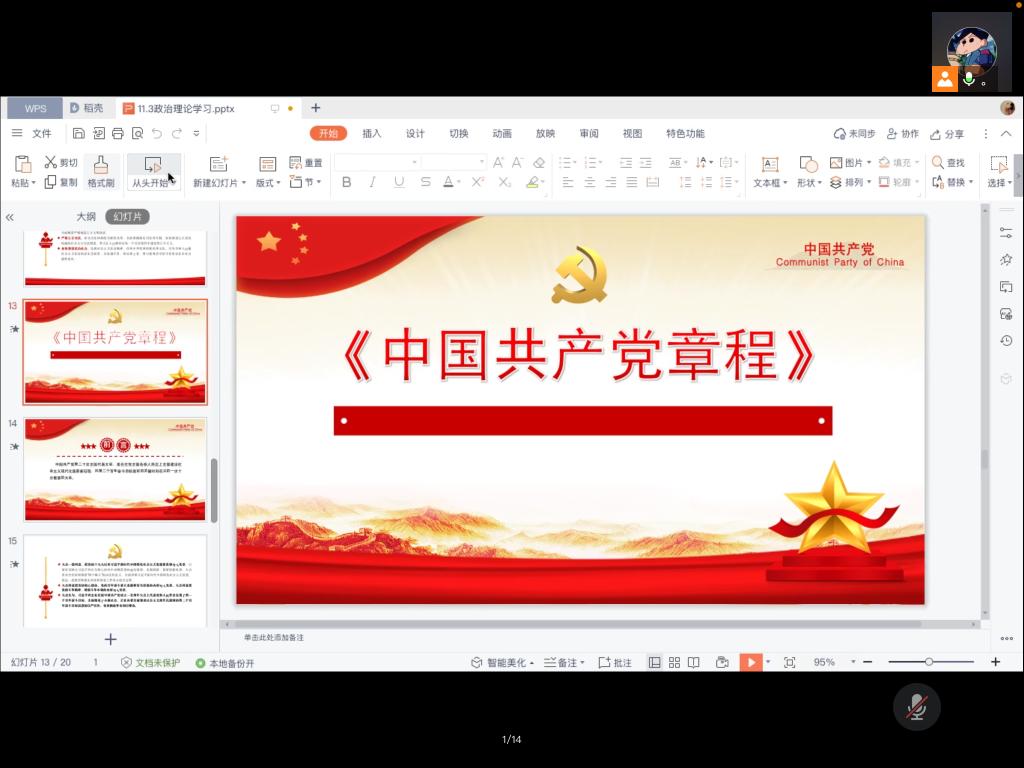 活动第二项,由党支部组织委员张艺璇同志带领全体党员学习《中国共产党章程(修正案)》。最新版的党章共修改107处,其中总纲部分修改58处,条文部分修改49处,张艺璇同志重点领学了《中国共产党章程》总纲部分。学习结束后,支部党员踊跃发言,联系个人实际谈认识、谈领悟。本科生崔少扬表示,党章是党的总章程,集中体现了党的性质和宗旨、党的理论和路线方针政策、党的重要主张,规定了党的重要制度和体制机制,是全党必须共同遵守的根本行为规范。作为学生党员,我们要以习近平新时代中国特色社会主义思想为指引,自觉学习党章、认真学习党章,自觉践行党章,牢固树立党章意识,带头争做学习党章、遵守党章的模范,做一名符合党章要求的合格共产党员。
