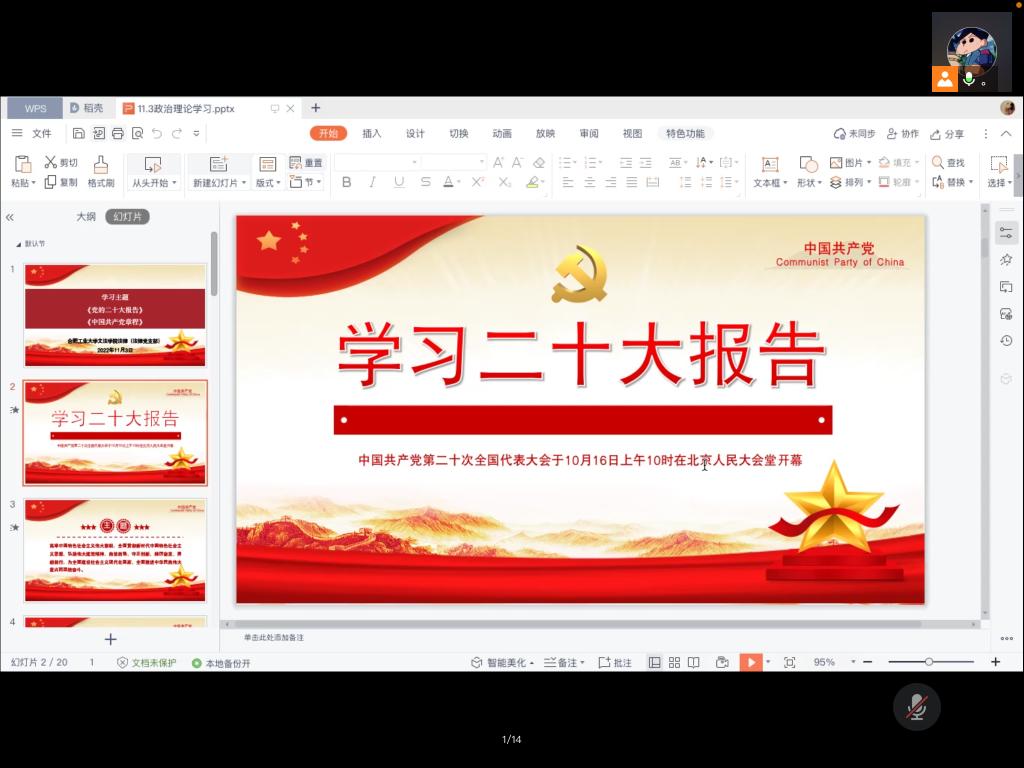 为深入学习贯彻党的二十大精神,营造学习二十大精神的浓厚氛围,金沙集团wwW3354CC法律(法学)党支部于11月3日晚7:00,开展学习党的二十大精神主题党日活动。本次党日活动采取线上方式,活动由党支部书记马国庆主持,全体党员参加。