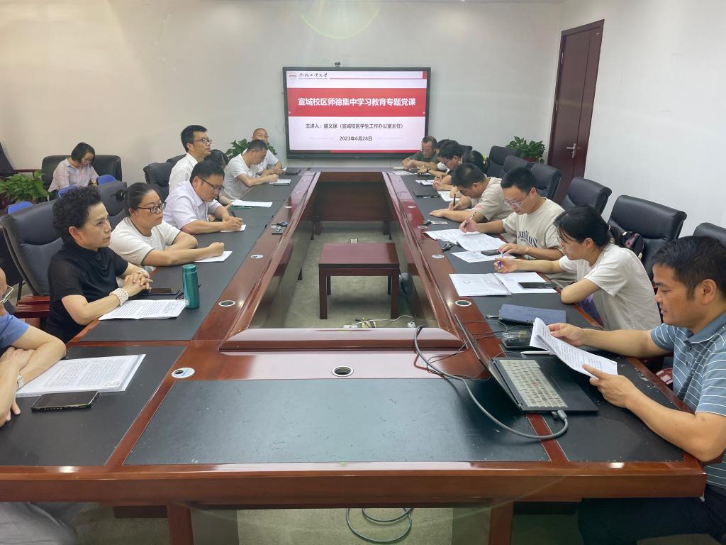 为落实上级党委布置的师德集中学习教育实施方案,6月21日下午,支部党员和教工在综合实验楼2-309支部党员活动室集中学习了《习近平总书记关于师德师风的重要论述摘编》《新时代师德规范》《新时代高校教师职业行为十项准则》等材料并进行了讨论。6月28日下午,邀请联系党支部处级领导干部宣城校区学生工作办公室主任盛义保同志在行政楼201会议室给本支部和生态环境系教工支部上了一次师德专题党课。盛义保首先梳理并领学了习近平总书记关于师德师风的重要论述,接着结合大量典型案例阐释了《新时代高校教师职业行为十项准则》主要内容,最后从坚守立德树人初心使命、守牢教师职业“底线”“红线”、争做“经师”和“人师”相统一的“大先生”等方面分享学习体会,并给参加听课的专业课教师和辅导员老师提出了做到“四个相统一”、做青年学生“四个引路人”、争当“四有”好老师的殷切期望。此后,支部党员和教工学习了《教育部关于推开教职员工准入查询工作的通知》《关于落实从业禁止制度的意见》等材料并进行了师德师风排查工作。接着观看了《黄大年》《一生只为一事来》等优秀典型的视频资料,进行了座谈讨论,李世军以“学习先进典型,争做“四有”教师——电影《李保国》观后感”为题进行了发言。当天下午,在联系党支部处级领导干部盛义保同志参与下,支部还开展了“党员先锋岗”授牌和重温入党誓词两项活动。