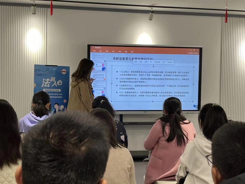 分享会上,同学们围绕法学经典影片和普法节目,通过PPT展示、精彩视频片段分享等形式,分组进行了精彩分享。其中,热播电视剧《底线》,通过对“雷星宇案”“葛晴晴案”等经典案件的层层铺开,展现了当代叙事视角下的法治中国图景和司法改革的进步成果,激发了在场不少同学们进一步观看影片的兴趣;著名电影《东京审判》中,法官梅汝璈力战群雄,坚定捍卫祖国利益,让同学们感到无比钦佩的同时,更引发同学们对历史的思考;《罗翔说刑法》系列节目中,罗翔老师用诙谐幽默的方式,向社会普及法律知识,弘扬社会正气,传播正能量,引得现场同学在开心一笑的同时,更加深了对法律知识的了解,增强了义务普法的决心……不同类型的法律影片、不同角度的剖析求证、独具特色的体会感悟,为法学生们后续进一步探索法律知识,拓宽学习渠道,奠定了良好基础。