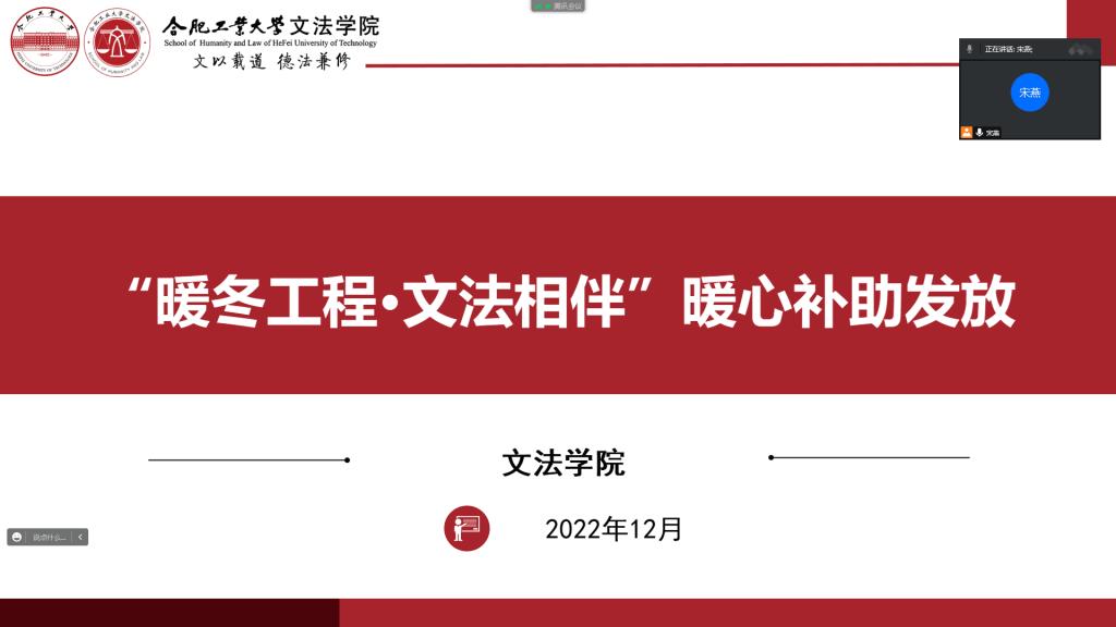 12月16日上午,学院通过线上会议,召开了“暖冬工程·文法相伴”暖心补助发放活动。学院各年级辅导员老师及全体受助学生参加了会议。