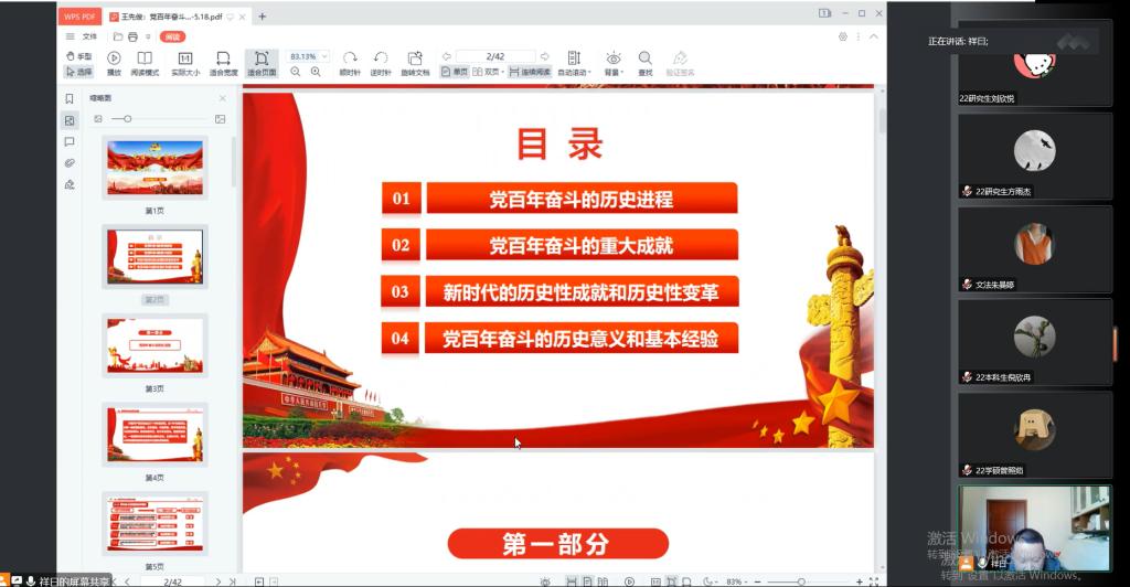 首先,顾书记从不同角度带领同学们回顾了党百年奋斗的历程,学习了百年党史的主题,主线和主流三个方面的内容,深刻认识和理解党的历史的基本内涵。随后带领大家从“三次伟大飞跃”,“四个历史时期”等方面了解党百年奋斗的重大成就。接着,从十三个方面,不同领域向同学们详细阐述了党的新时代历史性成就和历史性变革。最后,顾书记以五个方面、十个坚持、四个不变为线索,向同学们介绍了党百年奋斗的历史意义和基本经验。