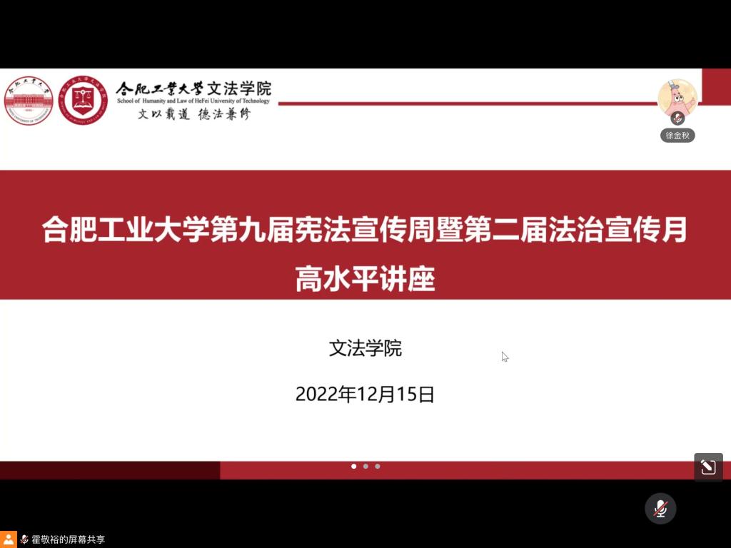 12月15日下午,合肥工业大学第九届“宪法宣传周暨第二届法治宣传月”高水平讲座于腾讯会议线上举行。本次活动特邀安徽金亚太律师事务所主任黄奥律师作题为“正义之辩——刑事辩护的责任”的专题讲座,由金沙集团wwW3354CC副院长霍敬裕老师主持,师生代表100余人参与本次讲座。