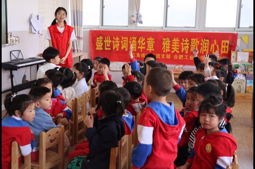 4月17日上午,“典”燃希望组的六名学生前往合肥市瑶海区三角线社区航运幼儿园,与中班的小朋友们一起学习《声律启蒙》和《诗经》。在这次活动中,六名学生志愿者以良好的心态,耐心地进行讲解,带领学生们详细的学习了声律启蒙一东和诗经篇目《硕鼠》,并积极引导学生们进行沟通交流,同时在幼儿园老师的帮助下顺利完成了既定目标,达到了宣传国风经典的目的。