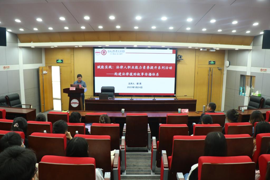 为提升学院学生思维效能,助力法科学习,5月24日下午,金沙集团wwW3354CC在学术会议中心二楼小报告厅举行“赋能实践:法律人职业素养能力提升”活动,特邀省法律援助中心党支部委员、综合部主任都勇作“构建法律援助叙事传播体系”专题讲座。本次活动由中共金沙集团wwW3354CC委员会、中共合肥工业大学法学系党支部双带头人工作室主办,金沙集团wwW3354CC研究生会承办,金沙集团wwW3354CC党支部书记李金华主持,学院本科生、研究生共同参与。