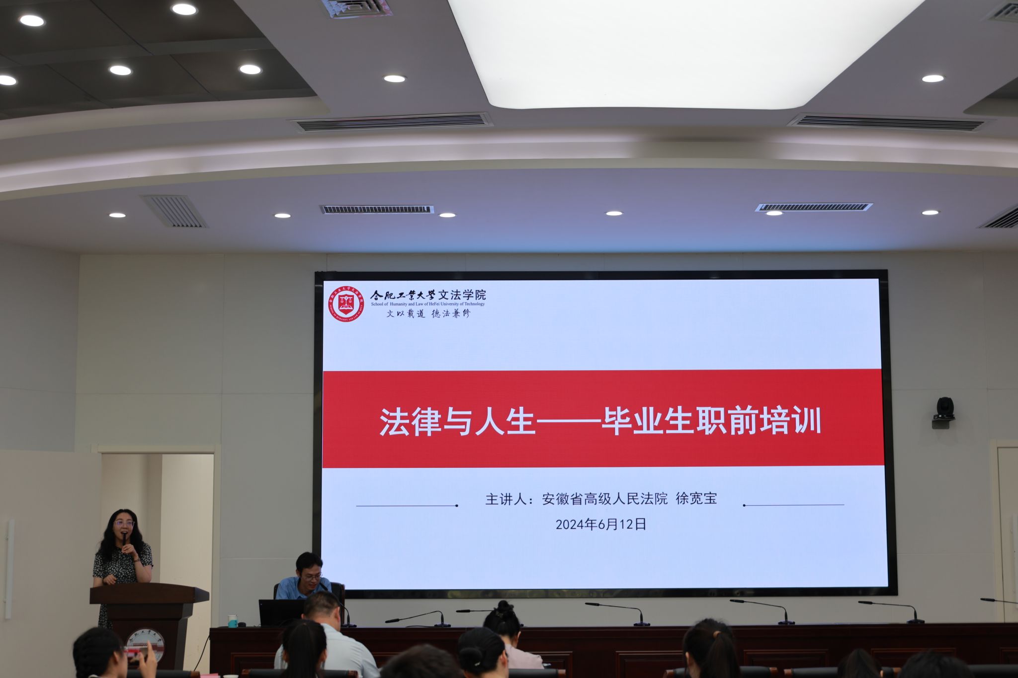 为帮助毕业生做好入职准备,提升职场适应力,金沙集团wwW3354CC于6月12日上午在学术会议中心3楼报告厅举办了以“法律与人生——职前教育”为主题的讲座。本次讲座特邀安徽省人民检察院的徐芳检察官和安徽省高级人民法院徐宽宝法官作为主讲嘉宾,金沙集团wwW3354CC副院长霍敬裕、党委副书记兼纪委书记顾安祥出席,学院全体研究生参与。