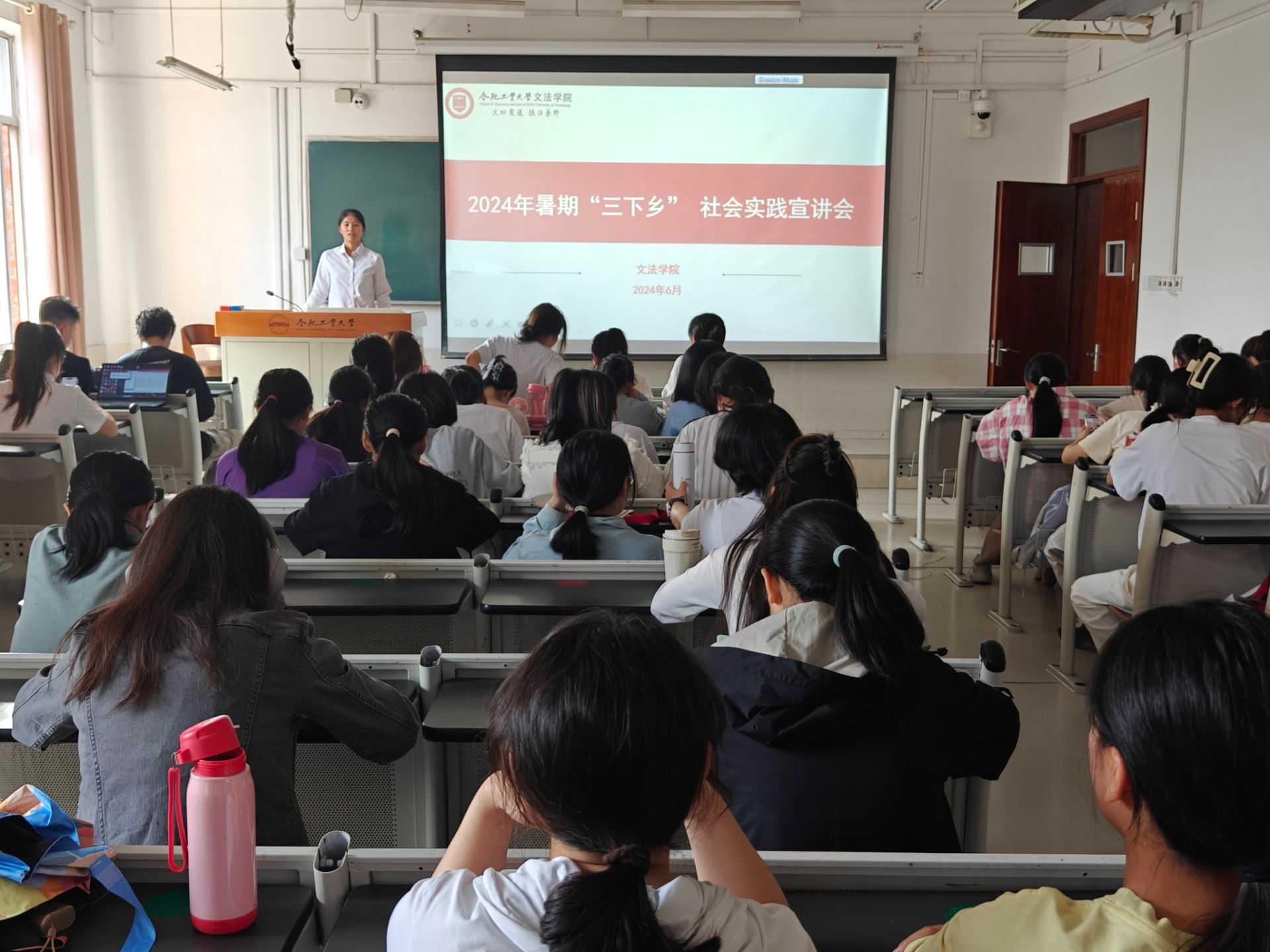 会上,顾书记充分肯定了学院近几年在社会实践方面取得的成果,结合学生真实案例,重点讲解了积极参与社会实践活动对于法学生综合素质全面提升的重要意义。随后,从学院支持、方案撰写、活动开展以及实践成果凝练等方面分享了自己丰富的经验心得,并强调了实践中安全纪律的重要性。最后,鼓励在场同学们积极参与本学年暑期社会实践,充分发挥专业优势,在实践中磨砺自我,争取再创佳绩。学院高年级优秀实践个人依次分享了她们的经验和感悟,重点结合自己参与“三下乡”活动的实际经历,生动讲述了在活动中的所见所闻、所思所感。学院团学负责人宋老师结合我校2024年暑期“三下乡”社会实践活动通知,向同学们详细介绍了本次活动的具体安排、注意事项等,并就如何准备、如何参与、如何发挥等方面提出了具体建议和要求。