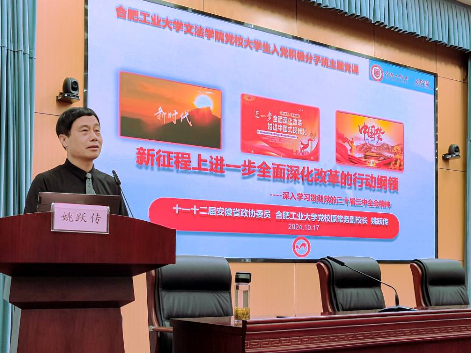 第十一、十二届安徽省政协委员、合肥工业大学党校原常务副校长姚跃传老师开展题为《新征程上进一步全面深化改革的行动纲领——深入学习贯彻党的二十届三中全会精神》的报告。在报告中,姚跃传老师阐述了党的二十届三中全会的重大意义,阐述了习近平总书记在全会上的重要讲话精神,解读了全会《决定》提出的进一步全面深化改革重大举措,特别是关于教育科技人才体制机制改革的新部署新要求。阐明了我们党对改革的规律性认识和将改革开放进行到底的坚定决心,向国内国际释放了我们党坚定不移高举改革开放旗帜的强烈信号。