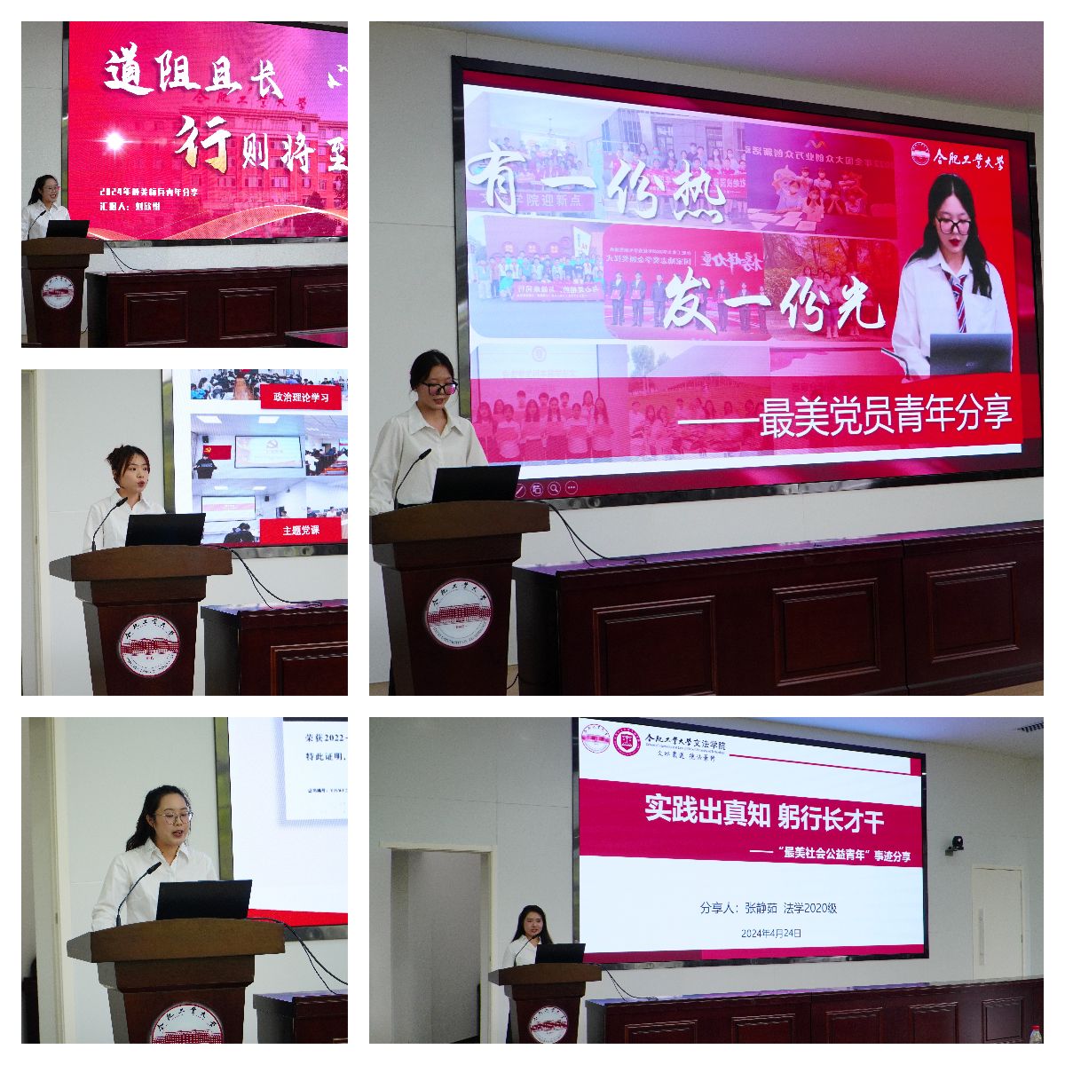 颁奖典礼后,获评学院2024年“最美青年”荣誉称号的4位优秀学生代表依次上台,通过PPT展示,分别就综合素养、科技创新、党员先锋、社会公益等方面分享了自己的奋斗历程和个人感悟,彰显了当代大学生的青春风采。