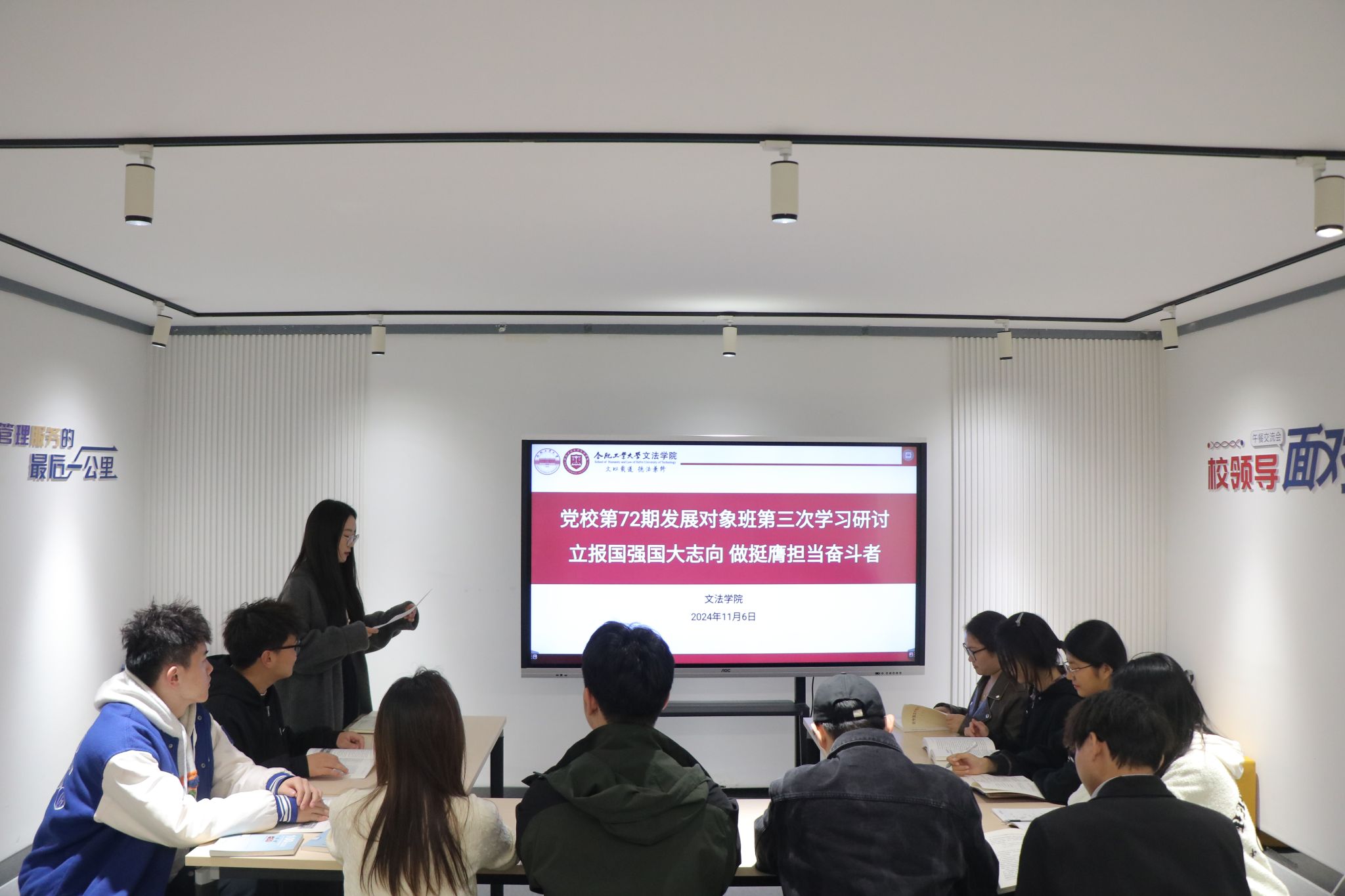为提升发展对象班成员政治思想水平,11月6日,学院党校第72期发展对象班在七号楼二楼学生社区开展了主题为“立报国强国大志向,做挺硬担当奋斗者”的理论学习研讨活动,发展对象班全体成员参与本次活动。