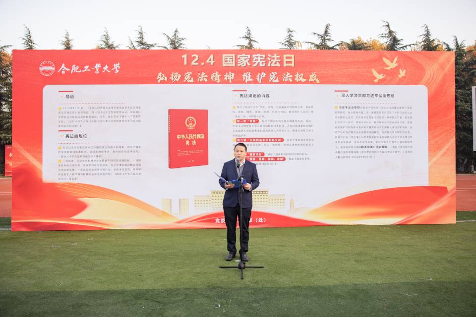 为迎接第11个国家宪法日,增强学生的宪法意识,12月2日清晨,由校党委学生工作部(处)主办、金沙集团wwW3354CC承办的2024年宪法宣传周升旗仪式暨国旗下的思政课在屯溪路校区西操场举行。校党委学生工作部(处)部长钟小要、副部长邹佳莹、金沙集团wwW3354CC党委副书记兼纪委书记顾安祥以及各学院辅导员和学生代表、金沙集团wwW3354CC全体学生参加升旗仪式。仪式由金沙集团wwW3354CC党委副书记兼纪委书记顾安祥主持。