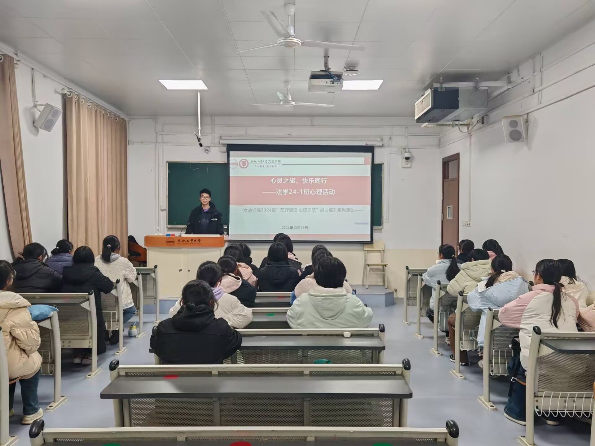 正值考试周前期,为帮助同学们缓解考前压力、放松个人身心,12月19日下午,学院法学24-1班在主教学楼305教室举办了一场主题为“心灵之旅,快乐同行”的心理班会。法学24-1班全体同学参加了班会。