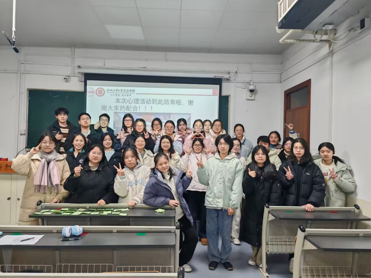 本次心理主题班会以团体辅导的形式开展。班会开始,辅导员宋老师首先介绍了本次活动的主题、目的和流程等,让同学们更好的了解到心理团辅对大家心理情绪的疏解和对班级凝聚力的作用。随后,班级心理委员叶克良同学带领大家依次进行活动,整场活动分为“团队破冰:‘生日排排序’”“团队初识:‘可怜的小兔子’”“团队加深:压力盒子”“团队共识:情景剧思考、心愿墙”。“生日排排序”“可怜的小兔子”,简单有趣的互动形式,打破了大家紧张的备考心情,迅速拉近了同学之间的距离,在欢声笑语中同学们迅速进入了轻松愉快的状态。“压力盒子”鼓励同学们将自己内心感到焦虑、不适的事情写在便利贴上,然后将其揉成团,投入垃圾桶,象征着将压力“清理”出内心。让同学们看到每个人都有自己的压力,对于自身而言,是要学会正确面对自身的情绪变化,学会释放自己的压力。随后,全体同学一同观看了心理剧《寻光,破焦虑》。短剧以贴近大学生活的场景和触动人心的情节为背景,讲述了主人公如何调整心态、突破焦虑状态的故事,引发了全体同学的共鸣,观看结束后,同学们纷纷表示对焦虑情绪有了更深的认知,并学到了调适心态的方法。活动最后,“心愿墙”环节,大家或写下自己的学期感悟或者写下对未来的期许或表达对同班好友的感激与鼓励,教室里充满了温暖与爱意的氛围。