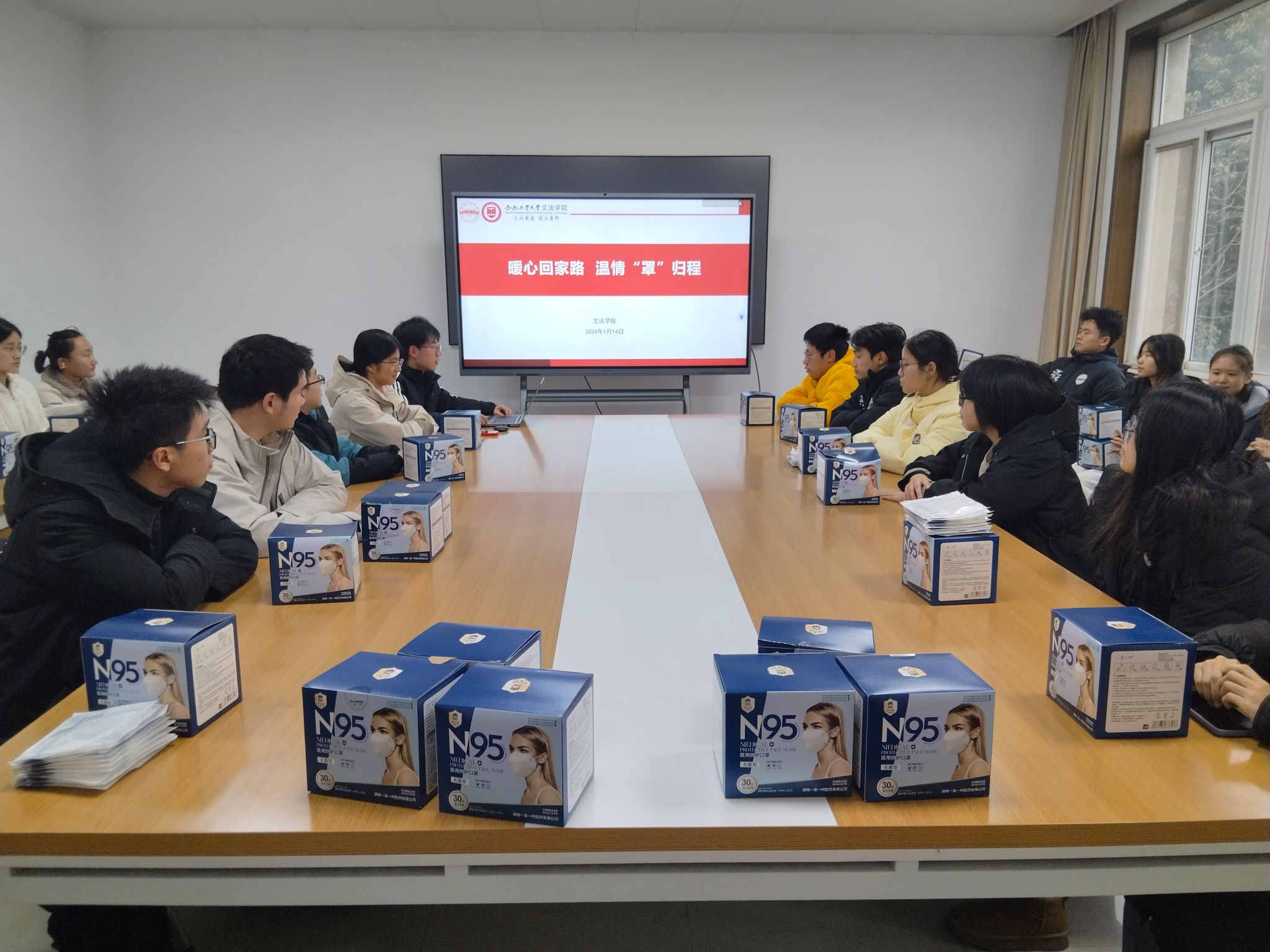 寒假将至,文法学子怀揣着对家的思念,即将踏上返乡归程。1月14日,学院统筹安排,组织学生在学院楼310开展“暖心回家路,温情‘罩’归程”暖心口罩发放活动,为学生返乡之路提供安全保障。