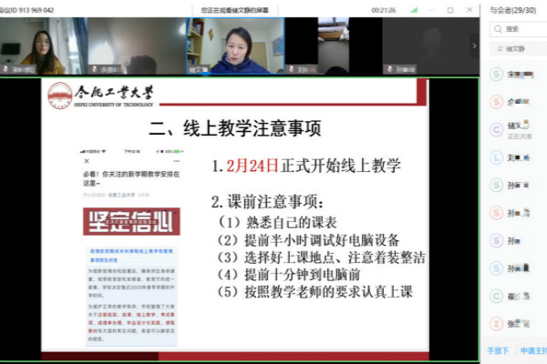 本次学前视频动员会,在前期收集调研学生问题的基础上,较为系统的梳理和解答了本科生目前存在的问题,引导全体本科生提前模拟了学院的线上教学环境,对稳定学生课前忙乱的心理起到了良好的稳定作用。会后,法学16-1班白云帆同学说,“疫情发生后,开学延迟,心理不免有些担心,这次视频会议,让我面对面的看到了我的同学和老师,疑惑也得到了很好的解答,让我倍感安心。”