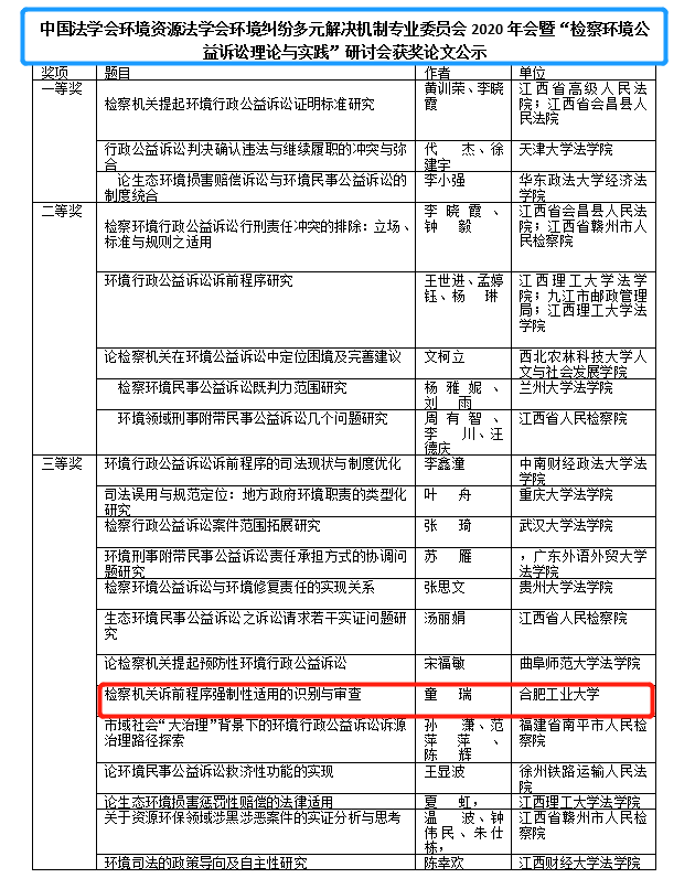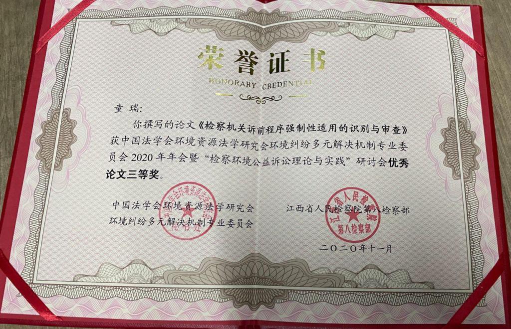 我院研究生童瑞撰写的论文“检察机关诉前程序强制性使用的识别与审查”获得此次研讨会征文三等奖。论文通过对2015年公益诉讼试点工作以来的案件梳理和数据分析,深度发掘作为诉前程序的本源基础,从不同的角度对检察环境公益诉讼的理论与实践进行分析,对法律制度、制度的实施以及社会参与等方面提出了较好的建议。