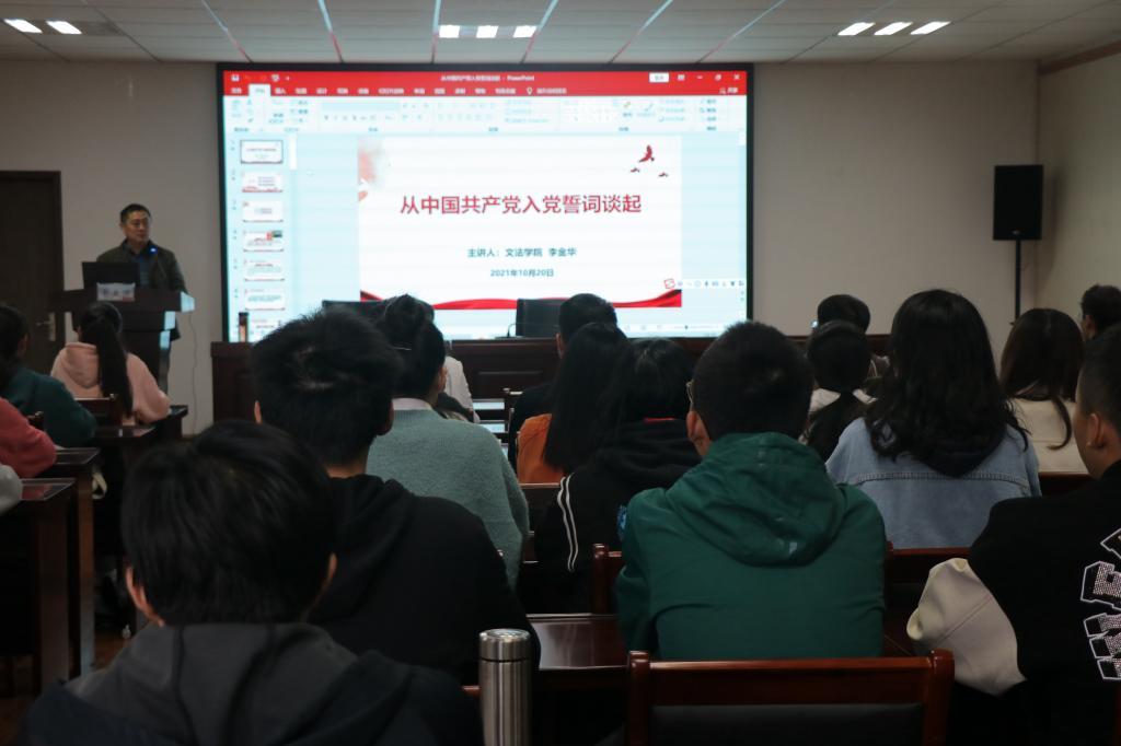 活动伊始,开班典礼在雄壮的国歌中拉开帷幕。随后主持人发表欢迎致辞,同时顾书记布置本期党校入党积极分子培训班培养方案,主要明确了本期培训班的总体要求以及课程设置情况。然后本科学员代表陈华敏同学发言。最后全体再次起立,齐唱国际歌。至此开班典礼正式结束,李金华老师开始上专题党课。党史教育课堂中,李金华老师紧紧围绕中国共产党入党誓词这一主题,从誓词的历史沿革、认识理解、中国共产党的成功之道几个方面进行讲解,结合自身经历对学员提出新要求,强调作为新时代的新青年,应坚决拥护党的纲领、执行党的决定、保守党的秘密,为共产主义奋斗终身。与会同学纷纷表示受益匪浅。