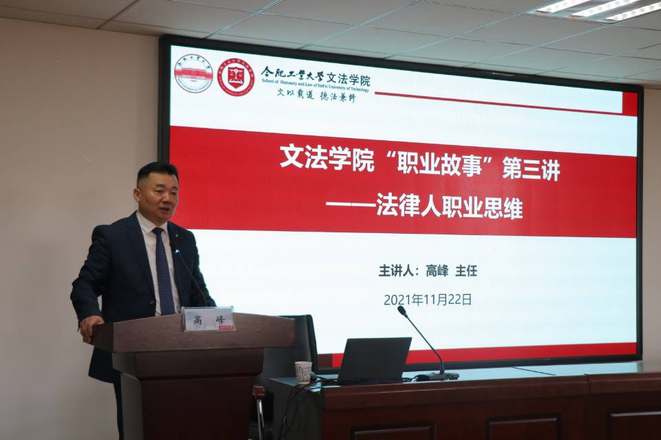 11月22日,学院“职业故事:我的法律之路”第三讲在学院楼509报告厅举行,北京金诚同达律师事务所高级合伙人高峰应邀作了题为“法律人职业思维”专题报告。报告会由学院副院长霍敬裕主持,近百名本科生和研究生参加。