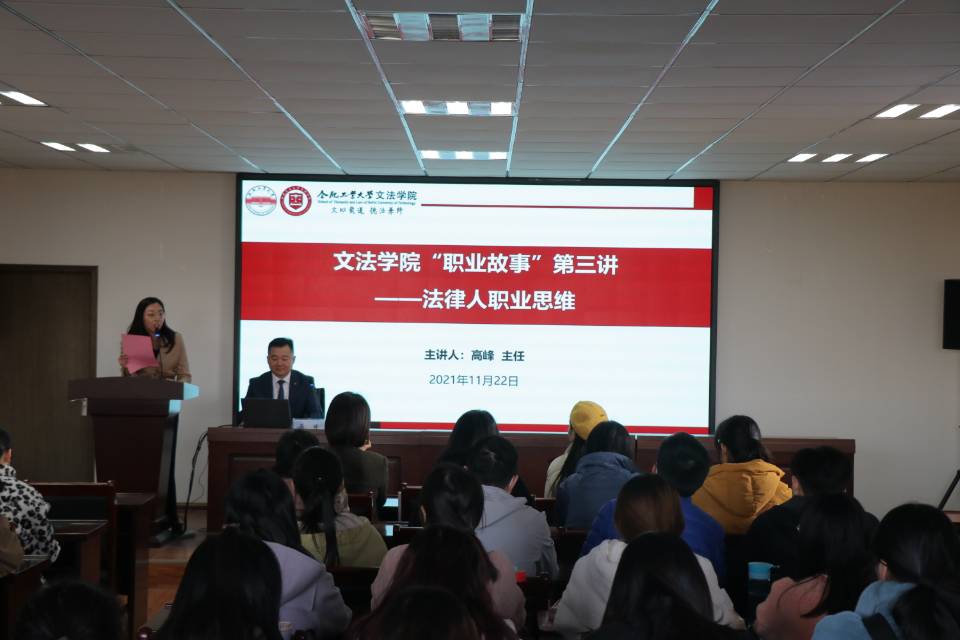 高峰主任首先介绍了北京金诚同达律师事务所的概况。紧接着通过引入原耶鲁大学校长理查德·莱文的一句话:“教育不教知识,却能让人胜任任何职业,教育不改变生活环境却改变人的思维方式;教育能让人幸福,幸福却取决于有意识的思维”来向大家讲解法律人所需要的职业思维。通过把律师和法科生进行对比,从阅历、语言、内容三个方面指出法律职业思维的内涵就是具备认知、分析、判断的能力。最后,高主任结合自身办理的实际案例,告知同学们以目的性为导向只能获得短暂的收益,做事情要有一个长期的规划和坚定的信仰。