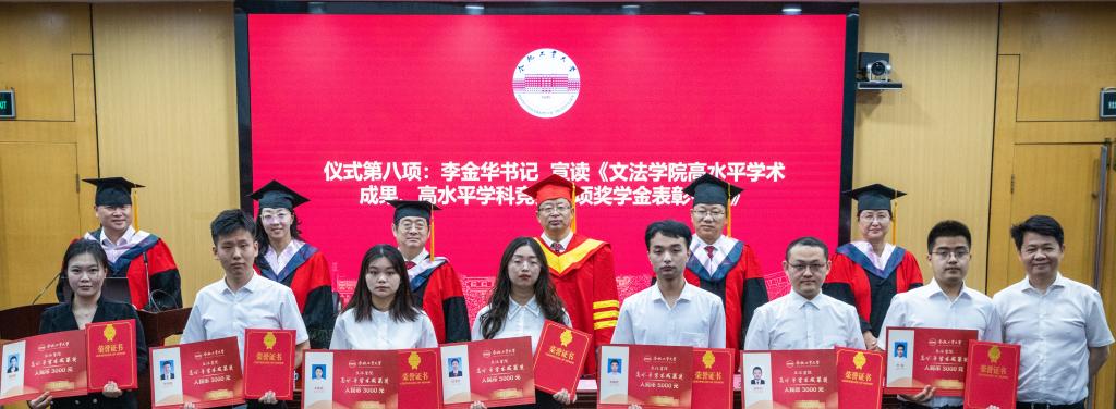 学院党委书记李金华宣读《金沙集团wwW3354CC关于表彰法学硕士研究生高水平学术成果、高水平学科竞赛专项奖学金的决定》,8位研究生获得专项奖学金。刘志峰副校长和学院领导为获奖同学颁发证书,北京金诚同达(合肥)律师事务所执行主任高鹏为获奖同学颁发奖金。